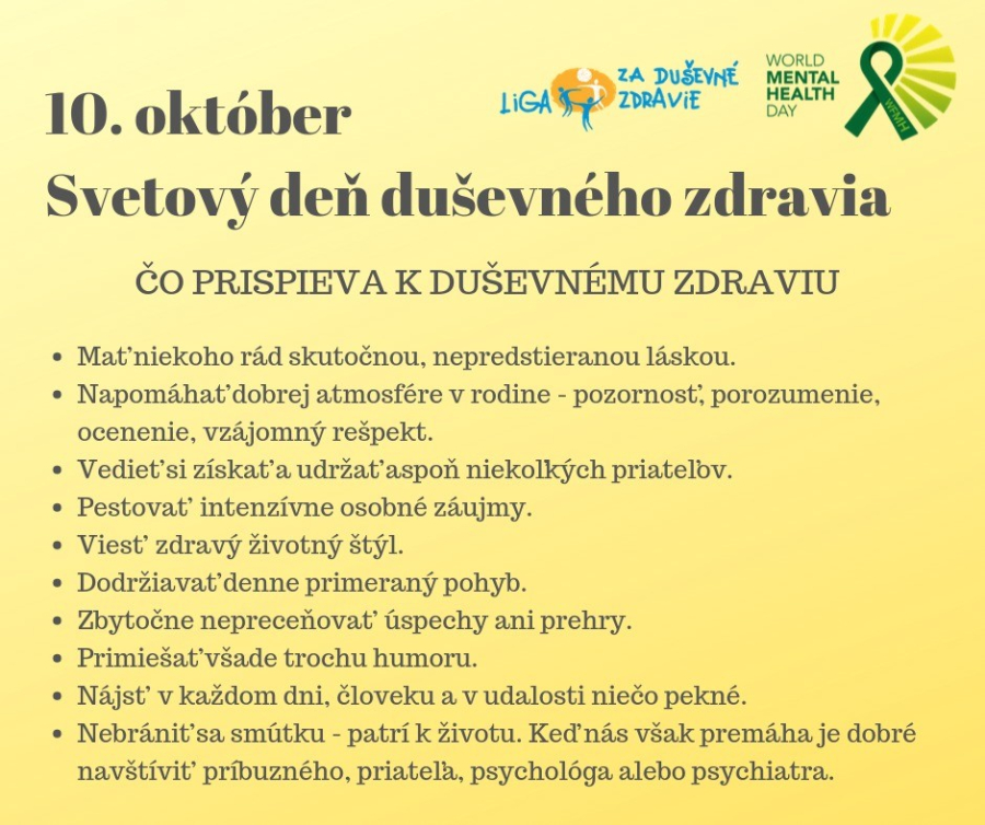 Určite sami viete, že ak sa cítite dobre a ste spokojní aj svet je odrazu krajší. Učme sa preto uvedomovať si ako sa máme, zastavme sa a užívajme si prítomný okamih. Usmievajme sa, nájdime si čas na priateľov, na samých seba, rešpektujme svoje potreby a potreby iných, poďme si zacvičiť, zabezpečme si dostatok spánku, poďme do prírody, vypnime mobily, televízory či počítače, nastavme si životné ciele, ale nezabúdajme, že je v poriadku, ak sa občas cítime smutne, no ak to trvá pridlho buďme odvážni a požiadajme o pomoc.