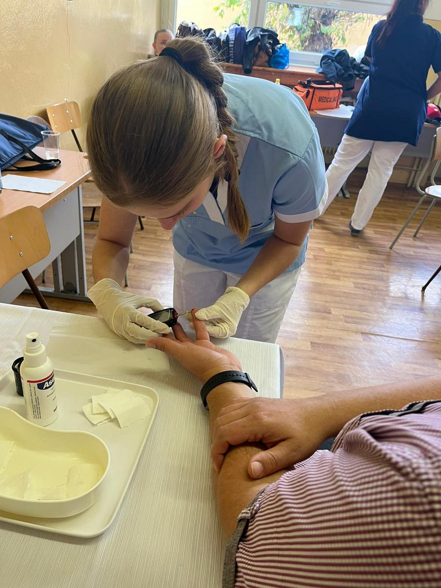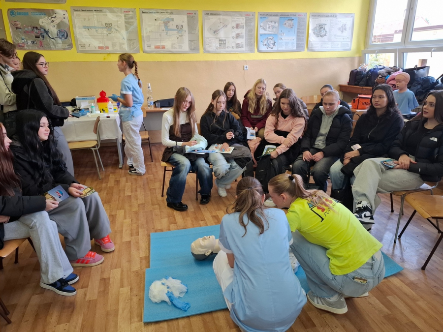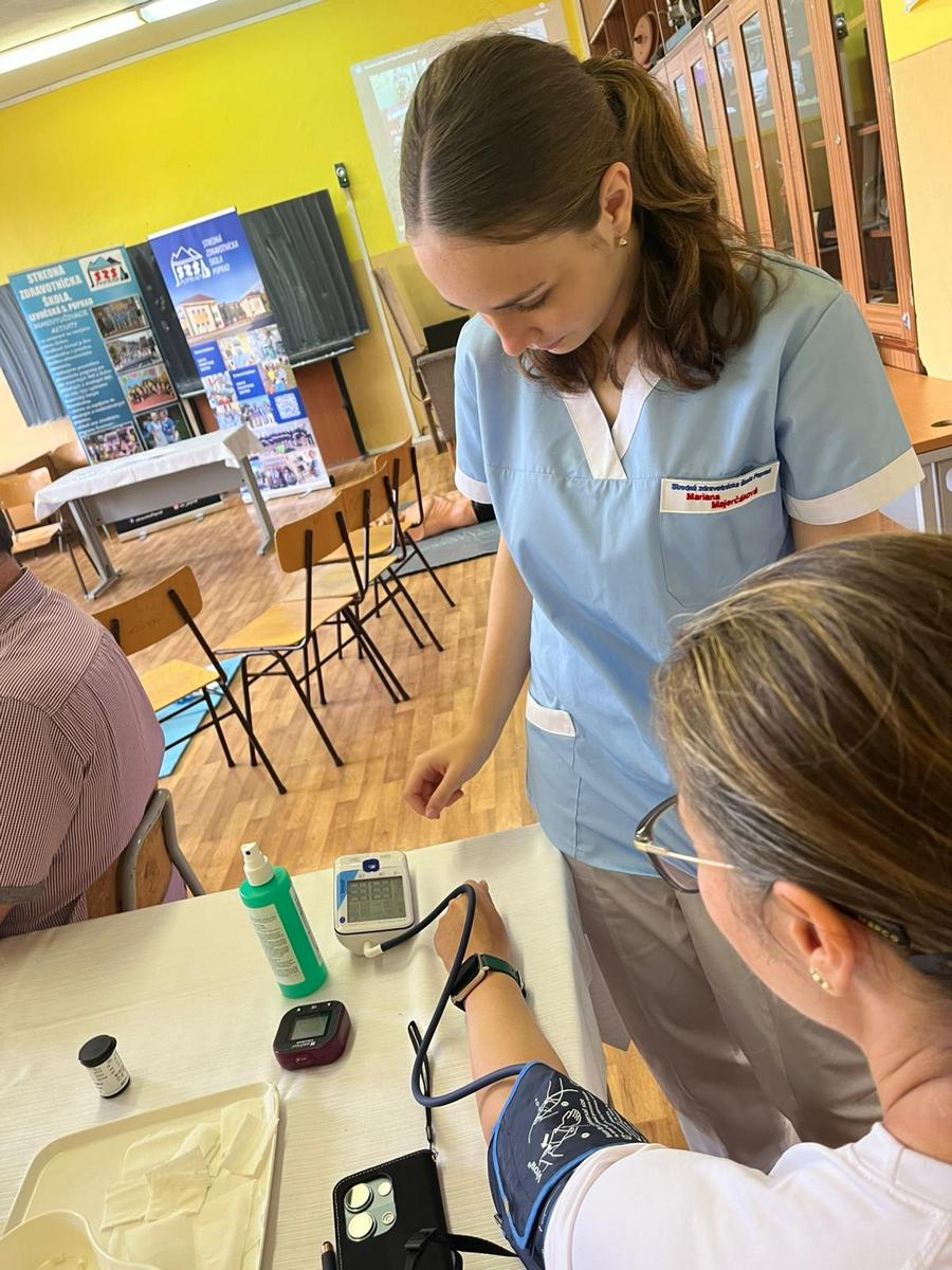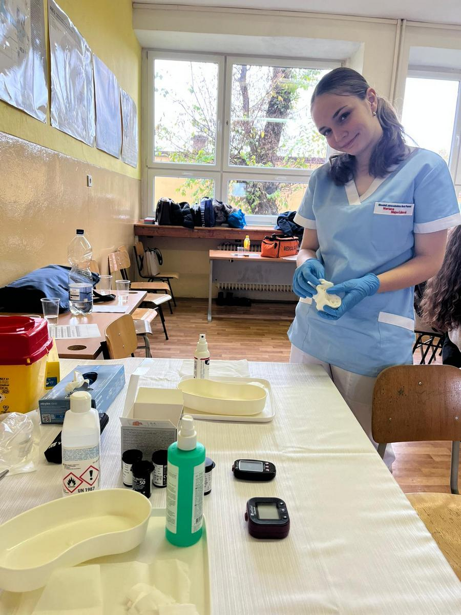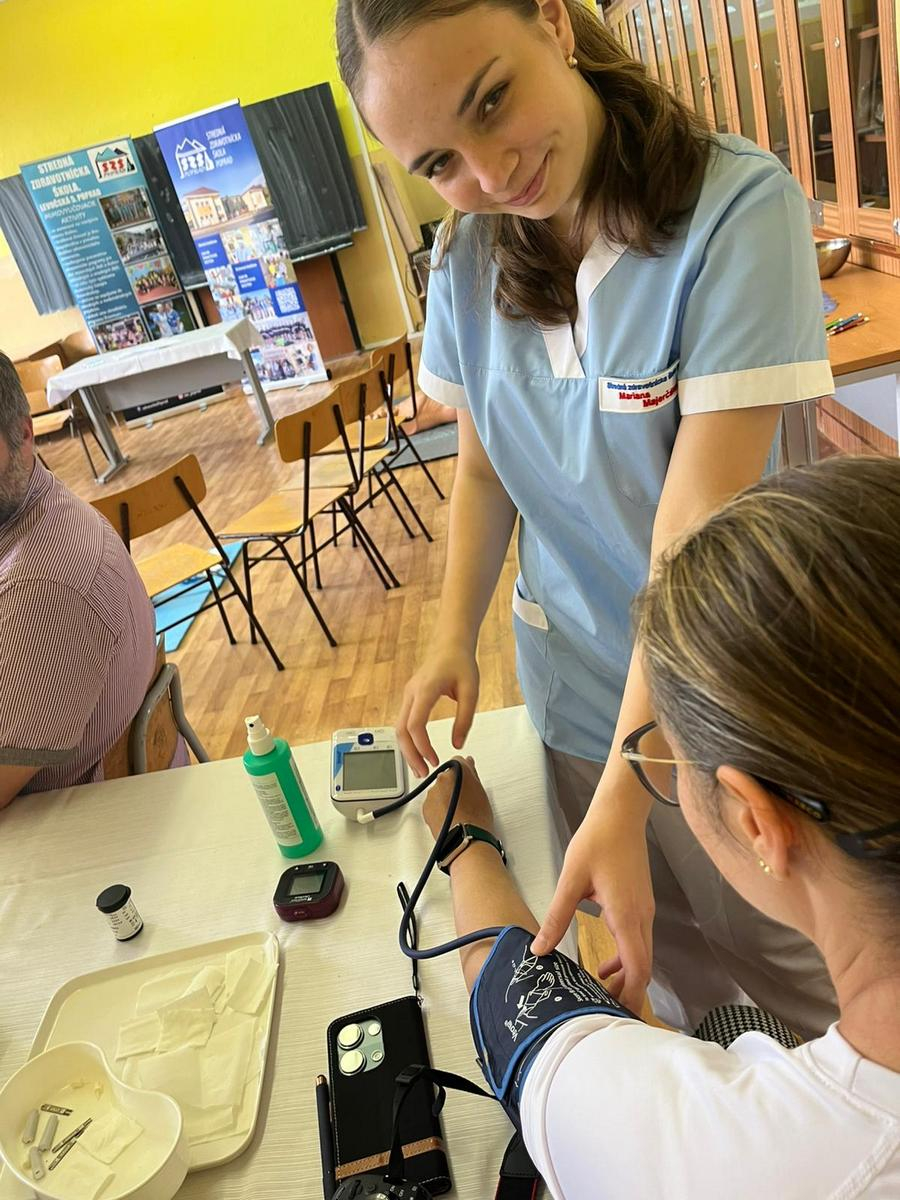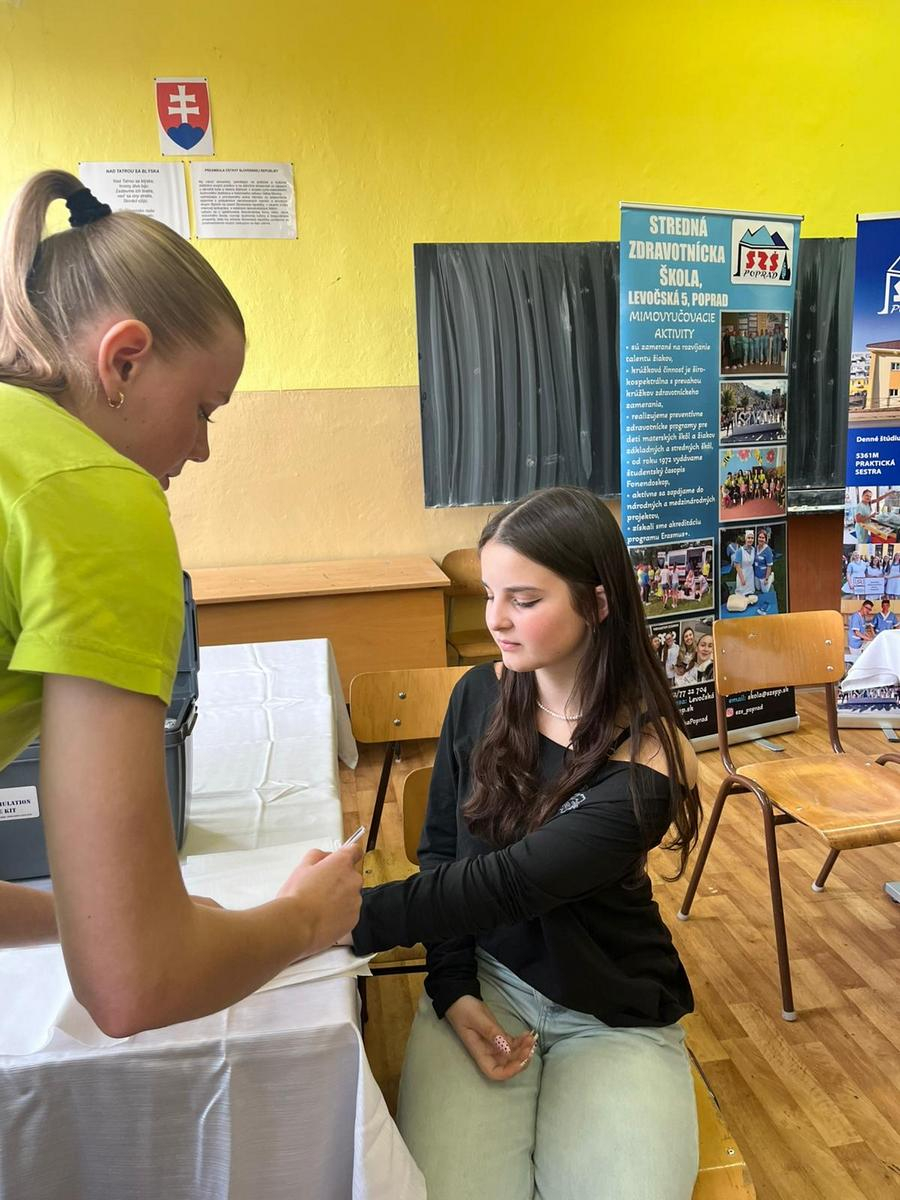 Naše žiačky dokázali realisticky znázorniť poranenia a, ako to na podobných akciách býva, maskovanie rán vzbudilo veľký záujem. Nechýbal ani tlakomer, ktorý sme reálne použili na meranie krvného tlaku. Sprevádzajúci pedagógovia zo základných škôl prejavili záujem aj o ukážku odberu kapilárnej krvi na vyšetrenie hodnoty glykémie.