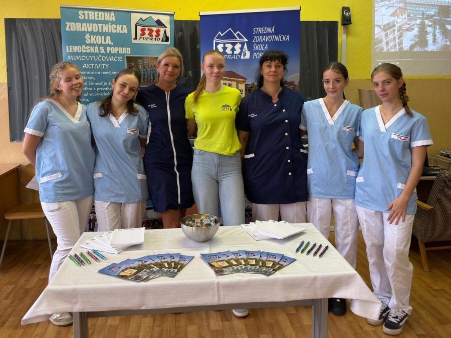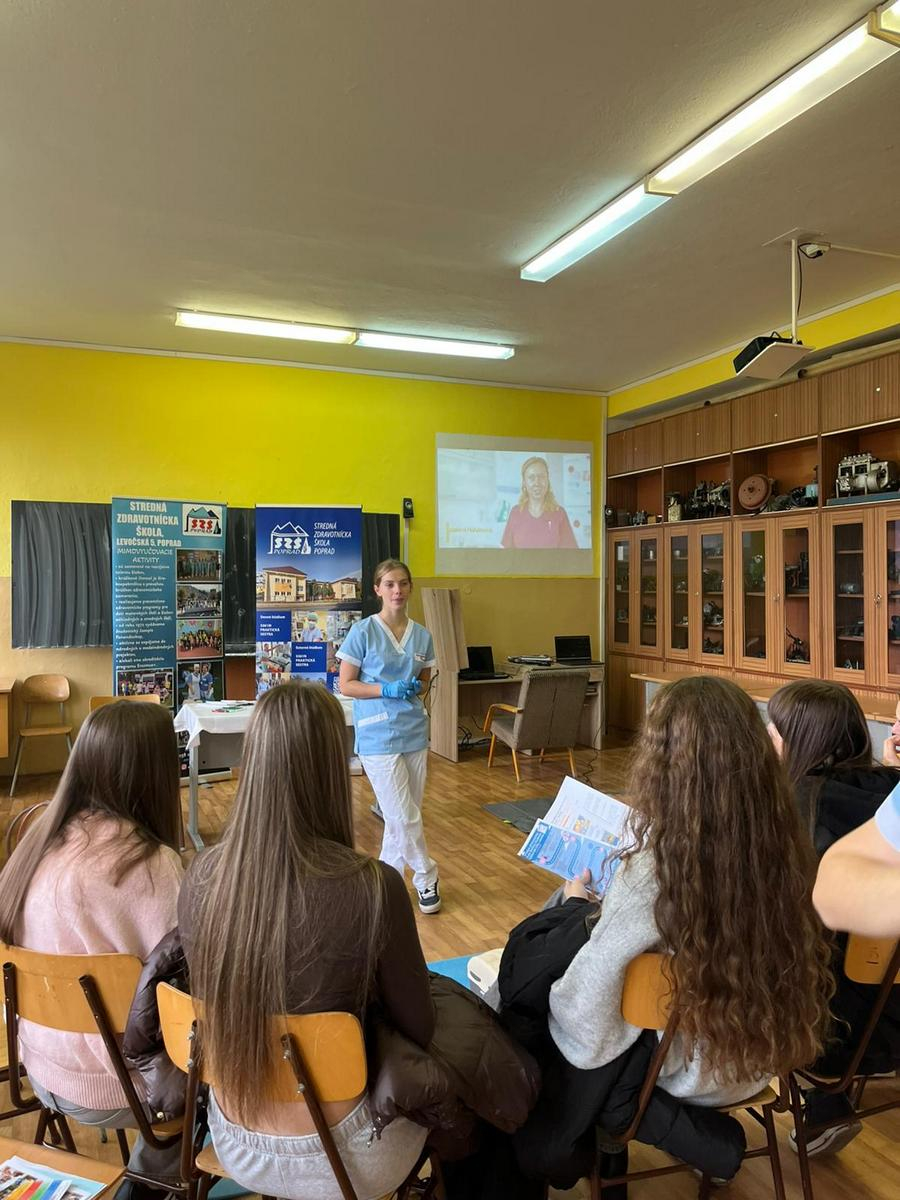 Našou hlavnou úlohou bolo osloviť čo najviac potenciálnych uchádzačov o štúdium na našej zdravotníckej škole v budúcom školskom roku. Preto v triede v pozadí bežala na interaktívnej tabuli prezentácia o škole a ošetrovateľskej starostlivosti, ktorú žiaci vykonávajú v nemocnici.