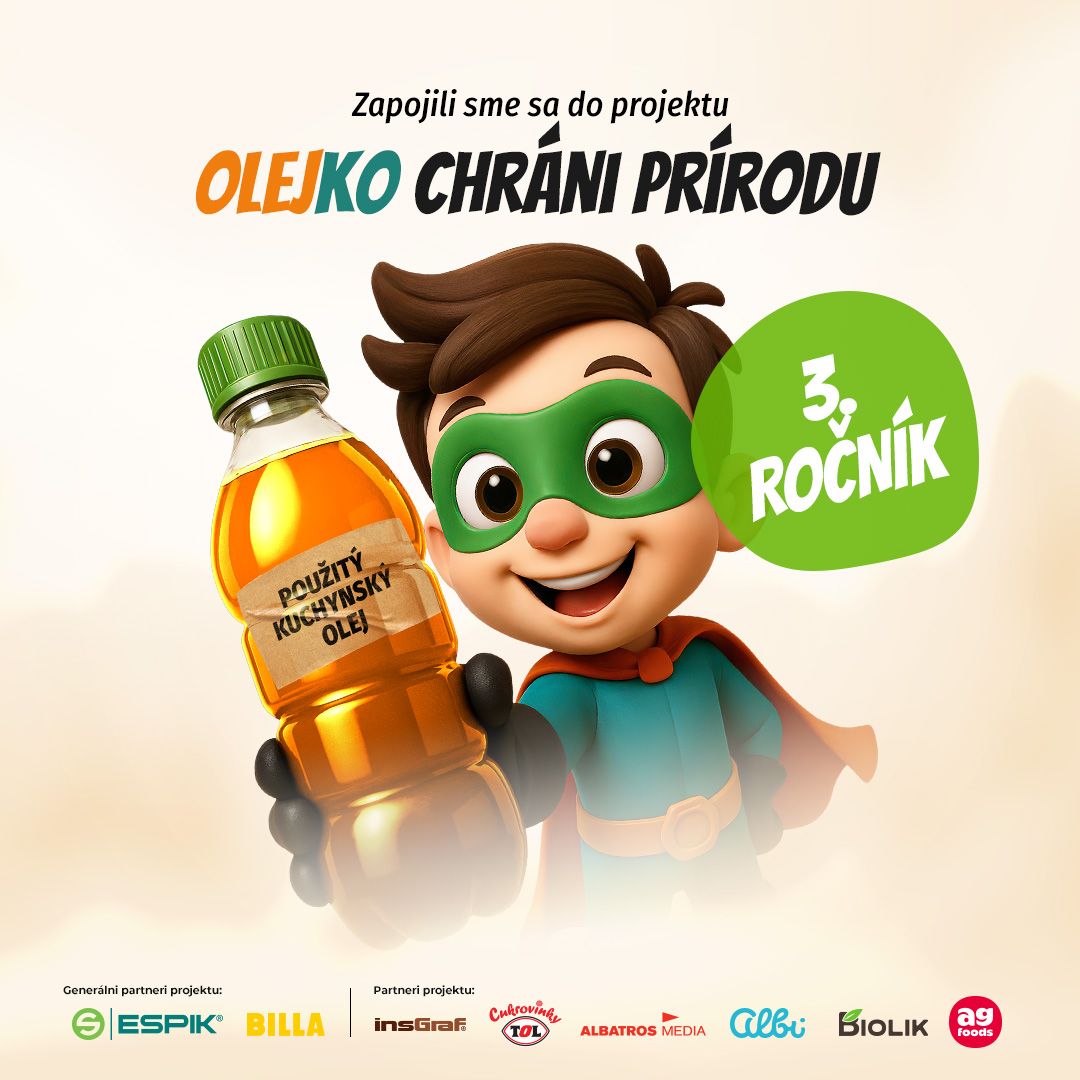 Životné prostredie môžeme chrániť dôkladnou separáciou odpadu, no najmä separáciou použitého kuchynského oleja. Preto sme vďační, že sme súčasťou projektu „Olejko chráni prírodu.“ Tento výnimočný projekt zapája materské, základné, stredné školy po celom Slovensku a učí deti, akým ďalším a zároveň jednoduchým spôsobom môžu prírodu chrániť. Projekt sa usiluje o ochranu životného prostredia formou správneho nakladania s použitým kuchynským olejom, ktorý produkuje väčšina z nás pri príprave rôznych vyprážaných jedál.