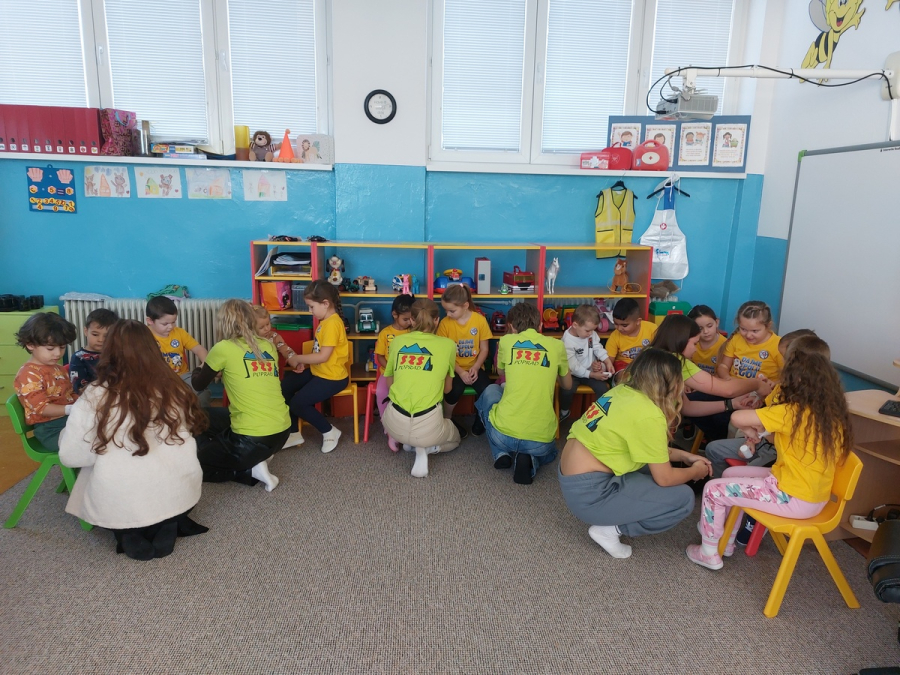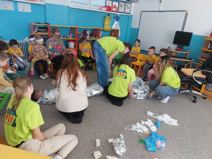V utorok dopoludnia (18.11.2025) sme navštívili MŠ Veľký Slavkov. Prostredníctvom hry sme deti naučili základy prvej pomoci: ako efektívne privolať pomoc, ako správne ošetriť časté poranenia (ako sú odreniny, popáleniny a zlomeniny) a prečo sú kľúčové protišokové opatrenia.